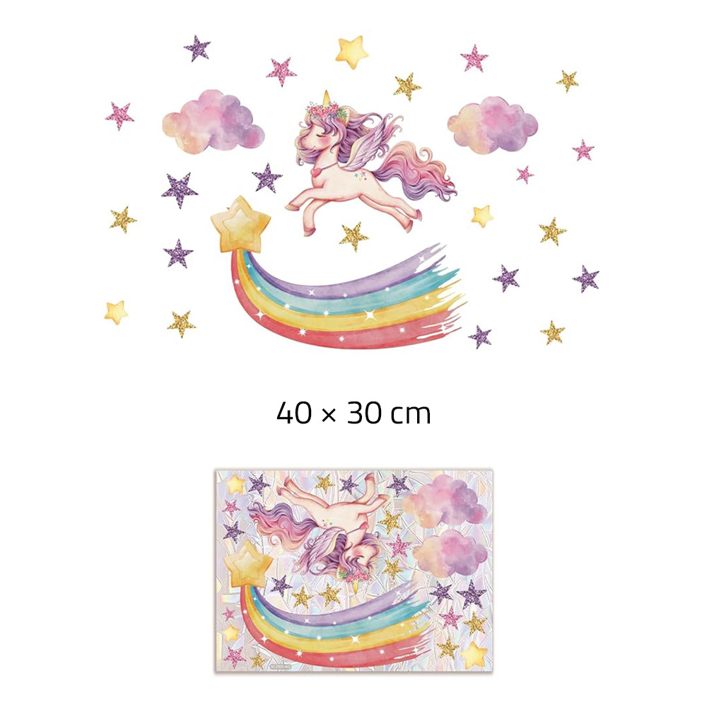 Okenní samolepka s jednorožcem vytváří při slunečním světle duhové odlesky a rozzáří dětský pokoj. Snadno se aplikuje bez lepidla a kdykoliv ji odstraníte bez stop.