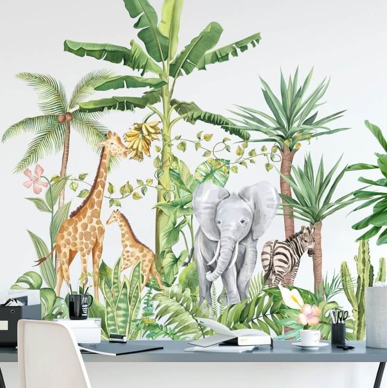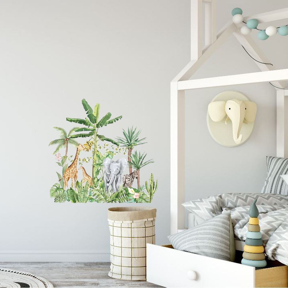 Samolepky do dětského pokoje dokonale vyšperkují každý dětský pokojíček. Motiv zvířátek v džungli. Na samolepce najdete dvě žirafy, zebru a slona. Dále navíc zelený les. Příjemné a reálné barvy. Jednoduché nalepení na zeď.