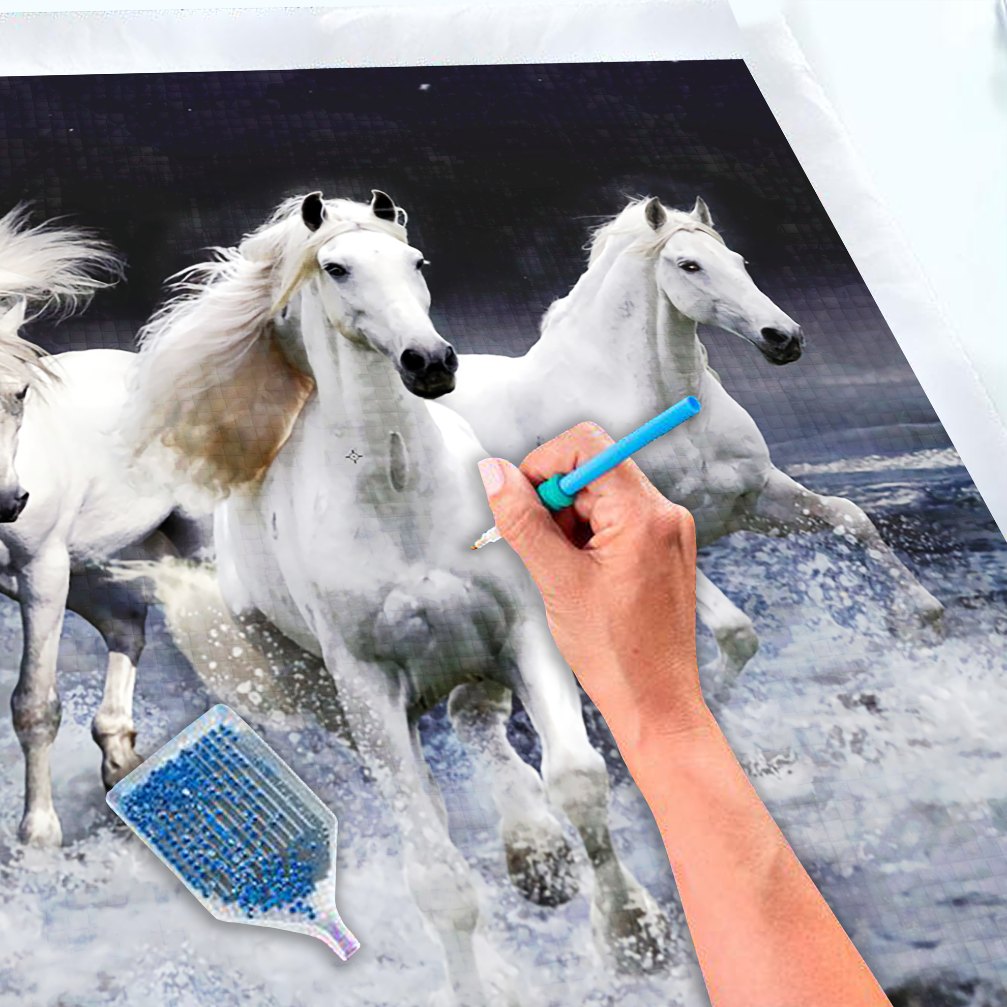 Plátno je zakryto ochrannou fólií, kterou sundávejte vždy postupně tak, jak budete aplikovat kamínky. Při sundání celé fólie najednou hrozí, že se ztratí viskozita lepidla a kamínky nebudou držet. Plátno obsahuje označení, která jsou umístěna i na sáčcích s kamínky. Dle těchto označení víte, kam který kamínek patří. Nejprve si do hrotu tužky naberte vosk, díky kterému se kamínky snadno přichytí na tužku. Kamínky tužkou aplikujte na plátno.
