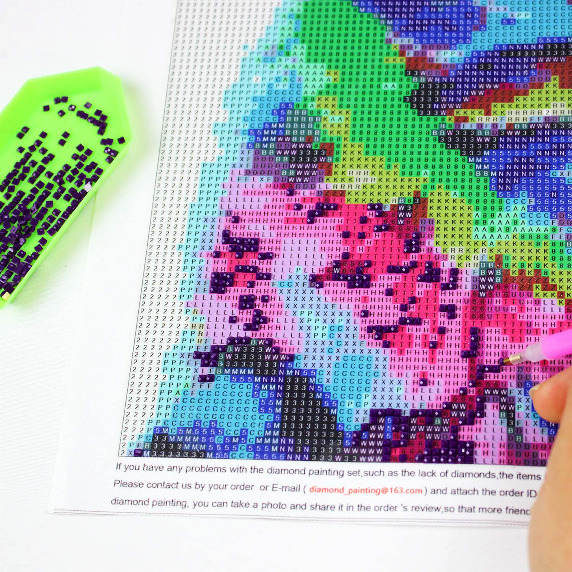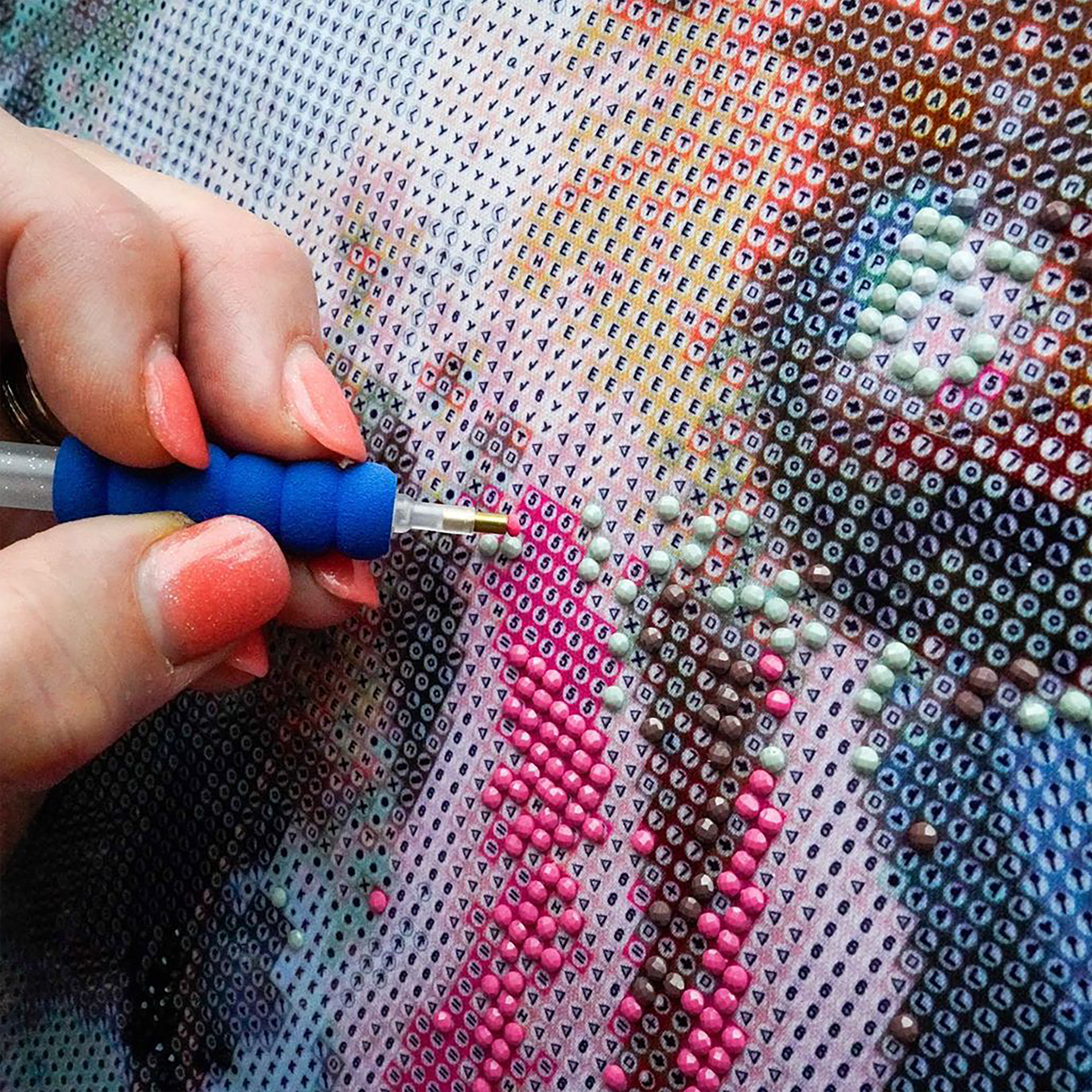 Plátno je zakryto ochrannou fólií, kterou sundávejte vždy postupně tak, jak budete aplikovat kamínky. Při sundání celé fólie najednou hrozí, že se ztratí viskozita lepidla a kamínky nebudou držet. Plátno obsahuje označení, která jsou umístěna i na sáčcích s kamínky. Dle těchto označení víte, kam který kamínek patří. Nejprve si do hrotu tužky naberte vosk, díky kterému se kamínky snadno přichytí na tužku. Kamínky tužkou aplikujte na plátno.