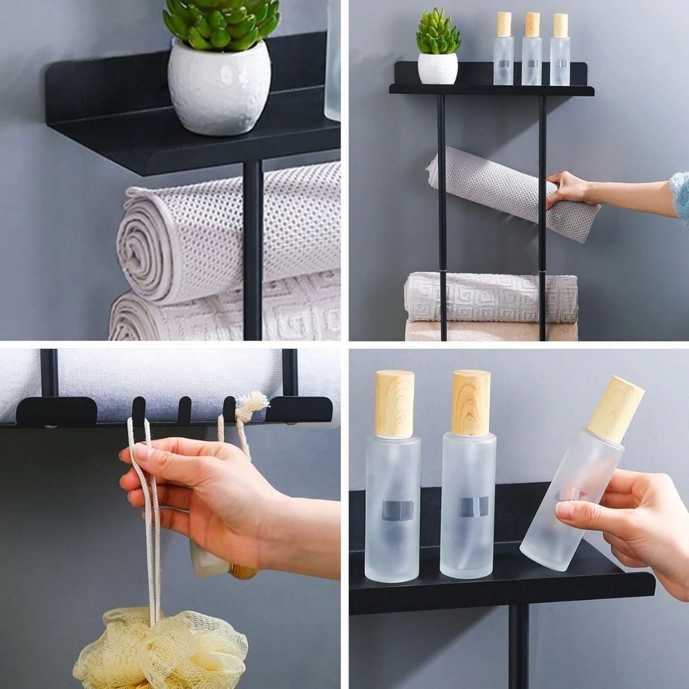 Elegantní černá kovová police s háčky a horní poličkou - skvělý pomocník do každé koupelny. Přehledně uložte ručníky, kosmetiku i koupelnové doplňky na jednom místě. Jednoduché sestavení a montáž bez vrtání díky samolepkám se šrouby v balení. Moderní design.