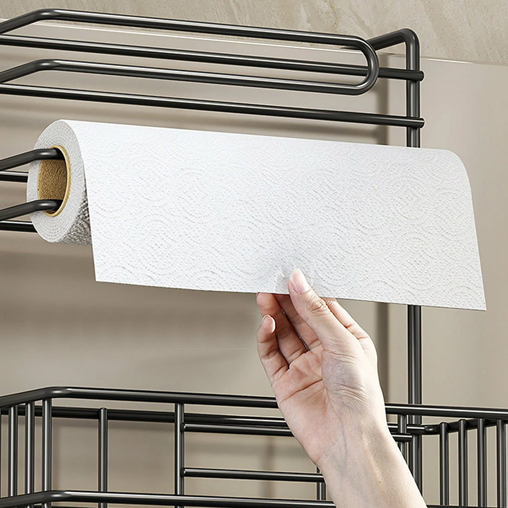 papírové utěrky a praktické háčky pro kuchyňské náčiní.