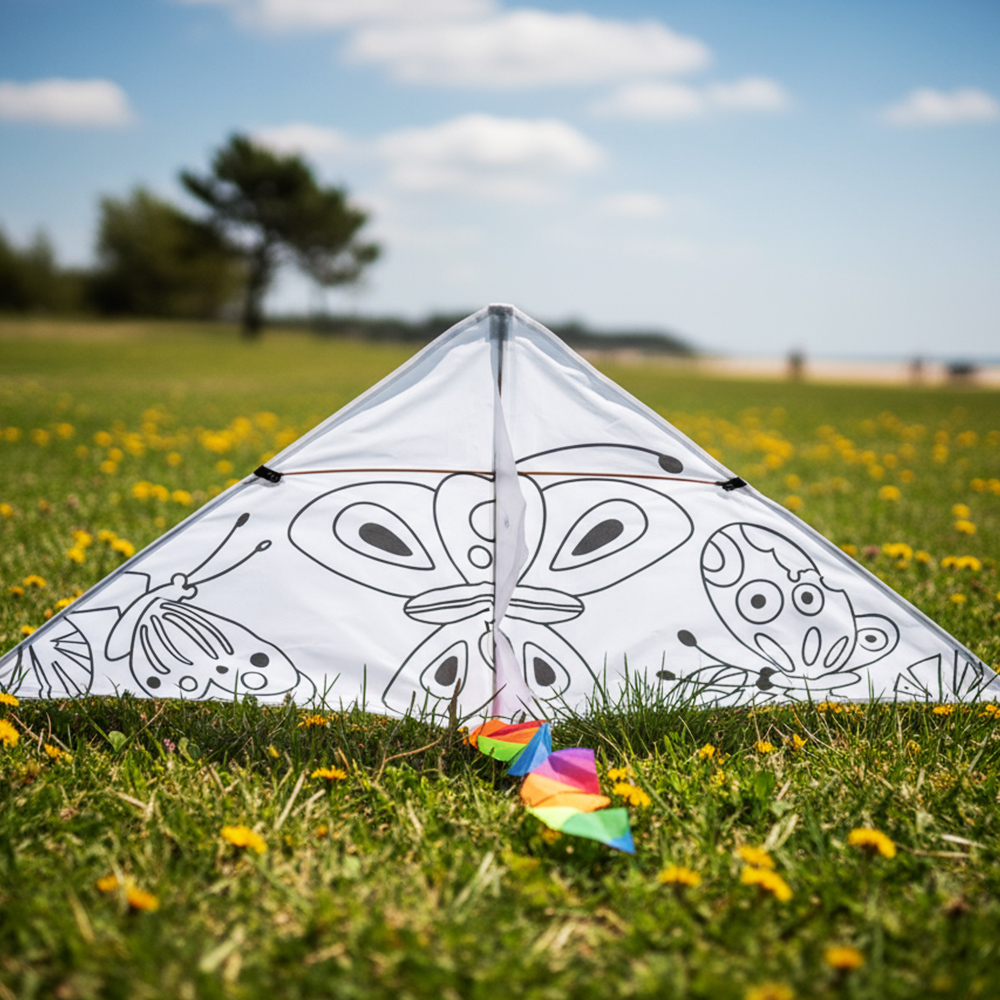 Tento krásný létající drak potěší malé i velké hned dvěma činnostmi. Můžete si ho totiž nejdřív vybarvit – součástí balení jsou i temperové barvy, které právě na toto můžete použít. A až máte vybarveno podle své fantazie, můžete jít draka pouštět ven. Díky svému trojúhelníkovému tvaru krásně létá a drží se ve vzduchu.