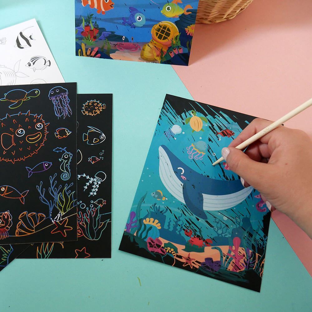Máte doma malého milovníka umění? Pak budou tyhle originální omalovánky ten pravý dárek! Seškrabávací obrázky patří k oblíbené kreativní aktivitě i mezi dospělými. Tyto jsou v menším provedením s dětskými veselými designy. Balení obsahuje celkem 9 kartiček s různými obrázky. Ty lze jednoduše seškrabávat speciálním perem, které je také obsaženo v balení. Při seškrabávání se pod černou vrstvou začnou objevovat veselé jemné barvy. Při seškrabávání obrázku nevadí, pokud děti přetáhnou přes okraj.