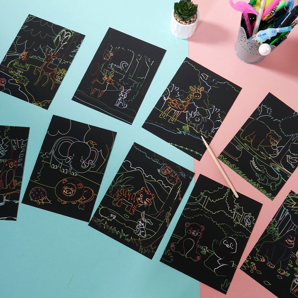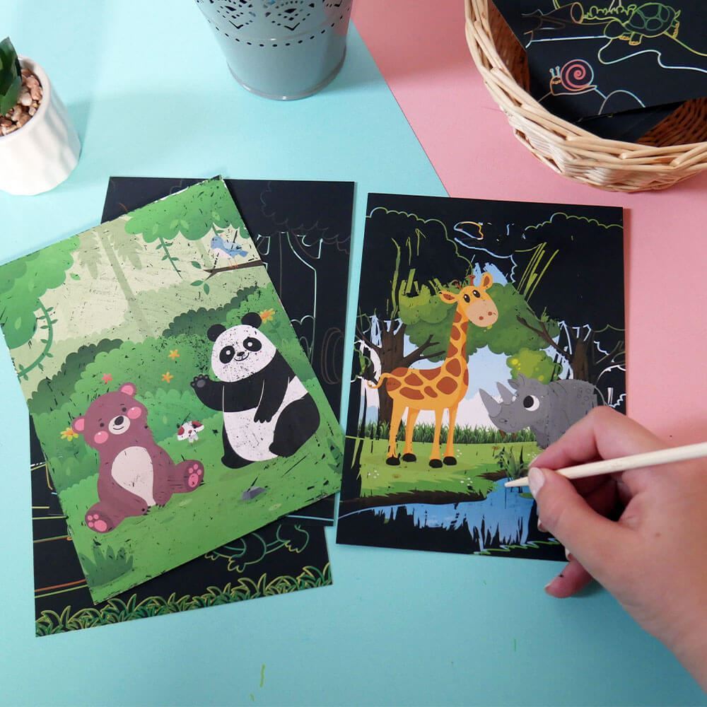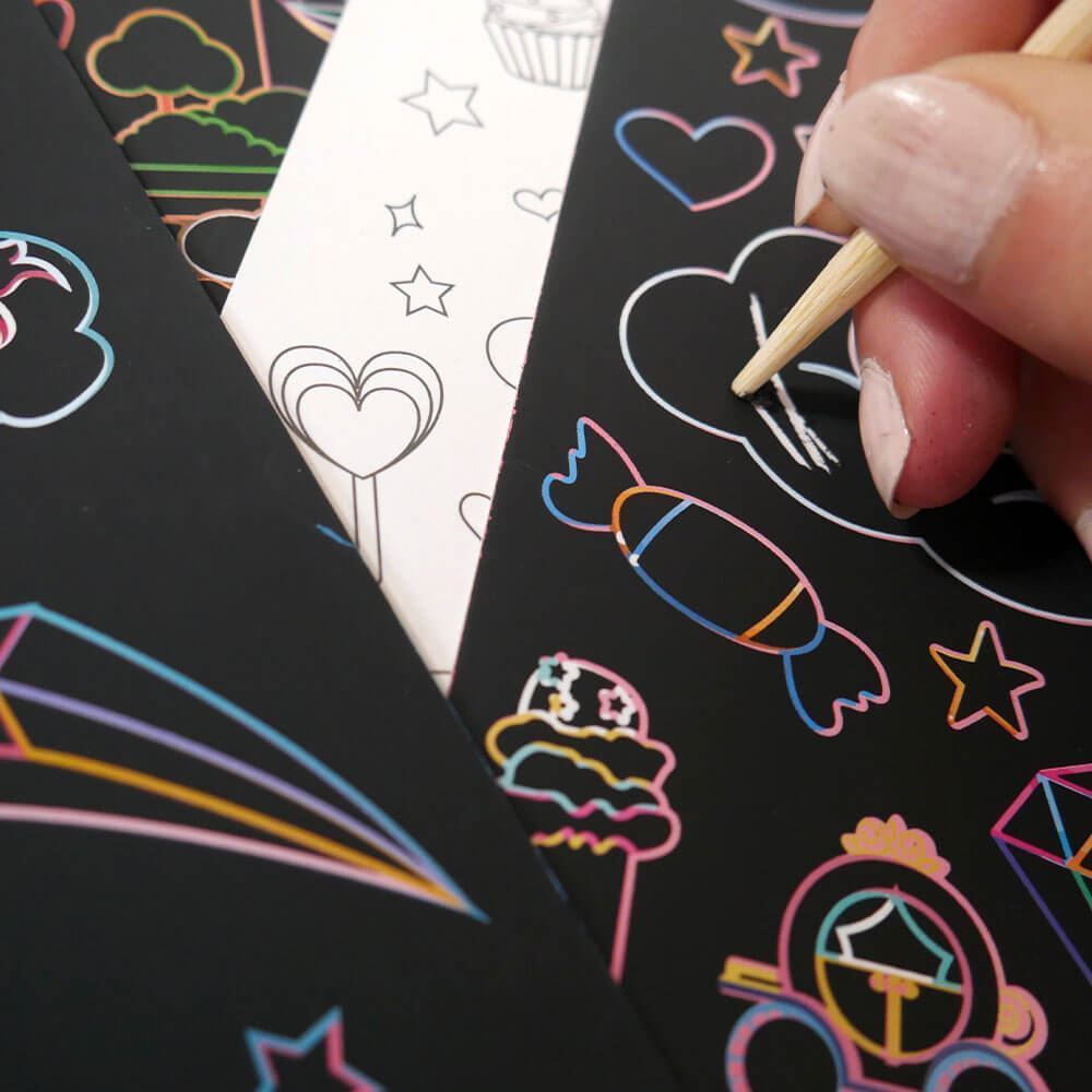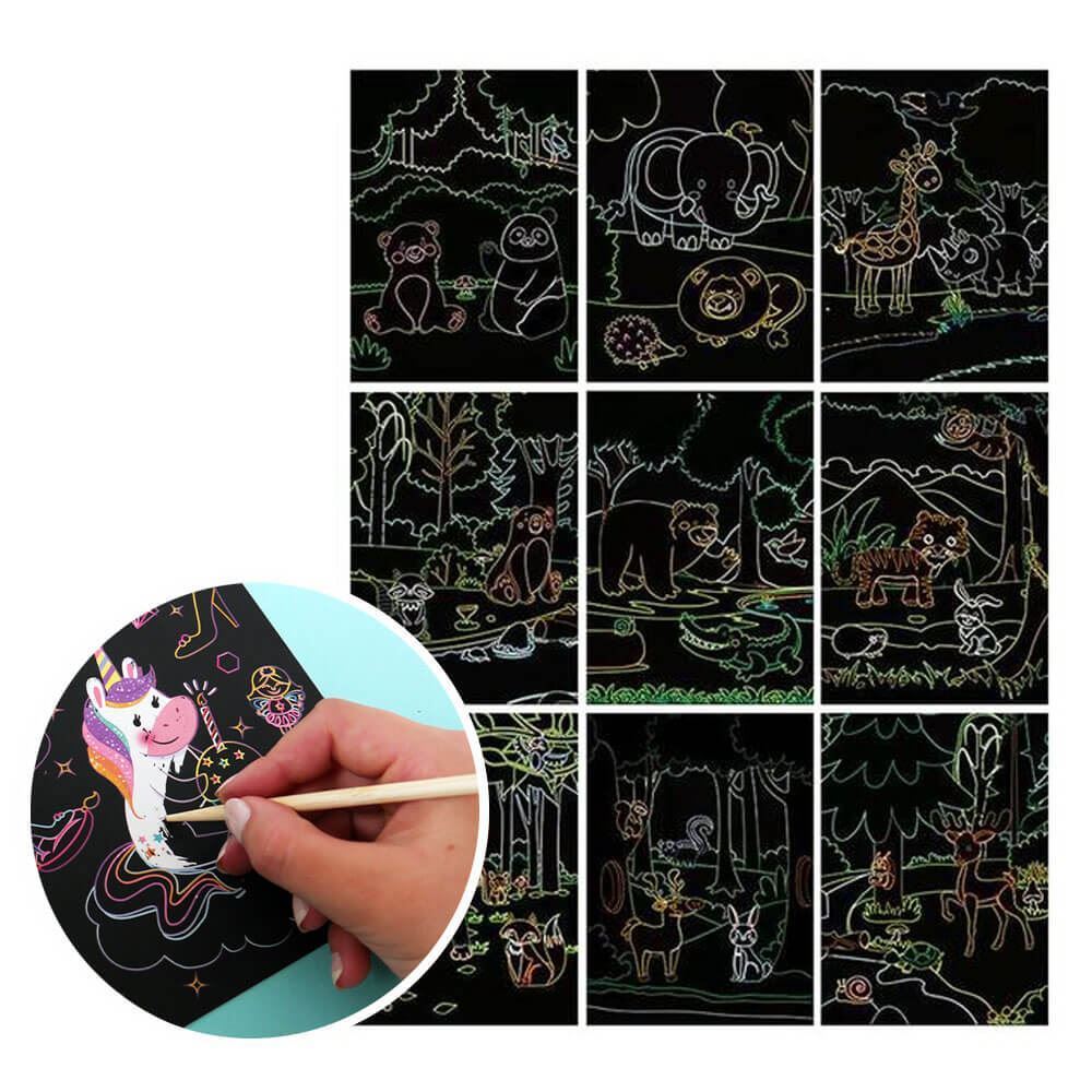 Máte doma malého milovníka umění? Pak budou tyhle originální omalovánky ten pravý dárek! Seškrabávací obrázky patří k oblíbené kreativní aktivitě i mezi dospělými. Tyto jsou v menším provedením s dětskými veselými designy. Balení obsahuje celkem 9 kartiček s různými obrázky. Ty lze jednoduše seškrabávat speciálním perem, které je také obsaženo v balení. Při seškrabávání se pod černou vrstvou začnou objevovat veselé jemné barvy. Při seškrabávání obrázku nevadí, pokud děti přetáhnou přes okraj.