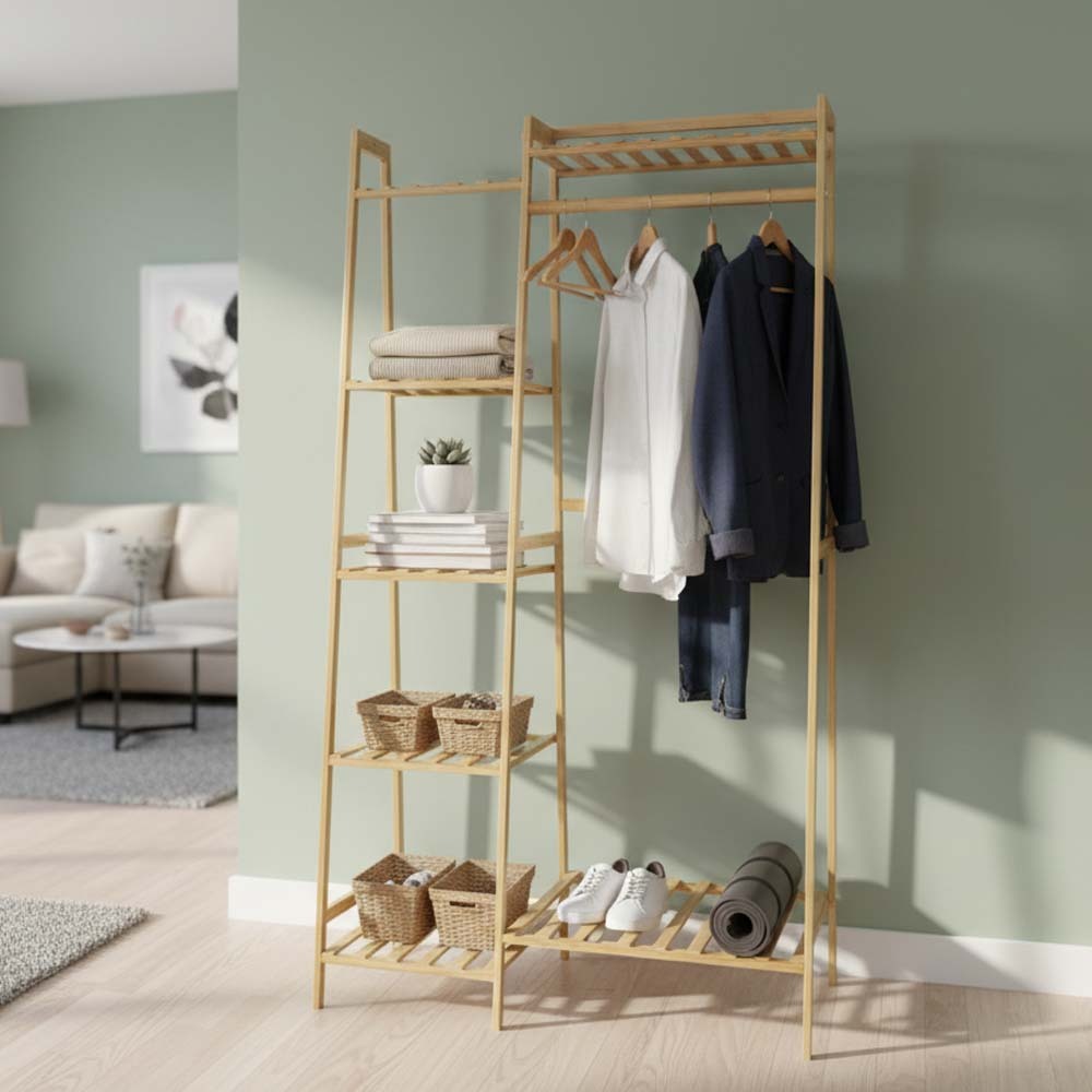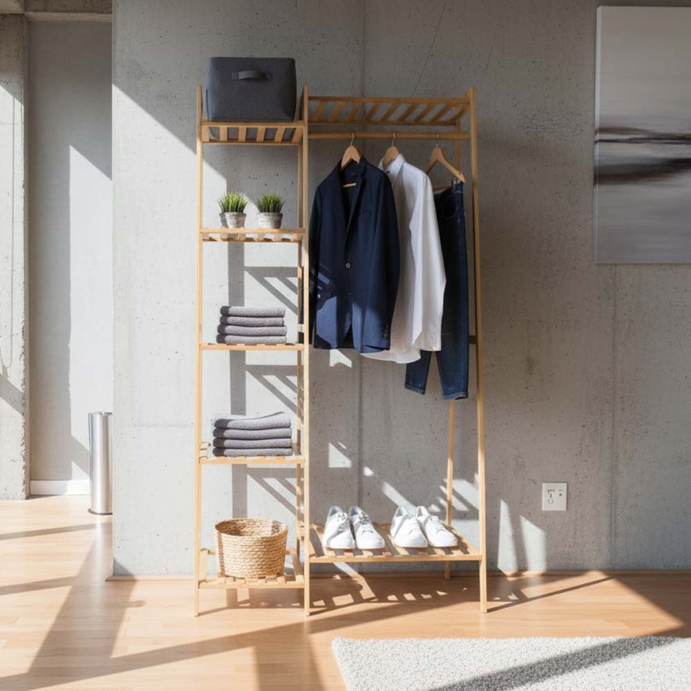 Uspořádejte si oblečení jednoduše a efektivně. Tento bambusový stojan vám poskytne dostatek prostoru pro zavěšení i uložení věcí. Díky policím budete mít vše přehledně rozdělené. Oblečení už nebude ležet na židli nebo posteli. Design zapadne do jakéhokoliv interiéru. Praktický pomocník pro lepší organizaci.