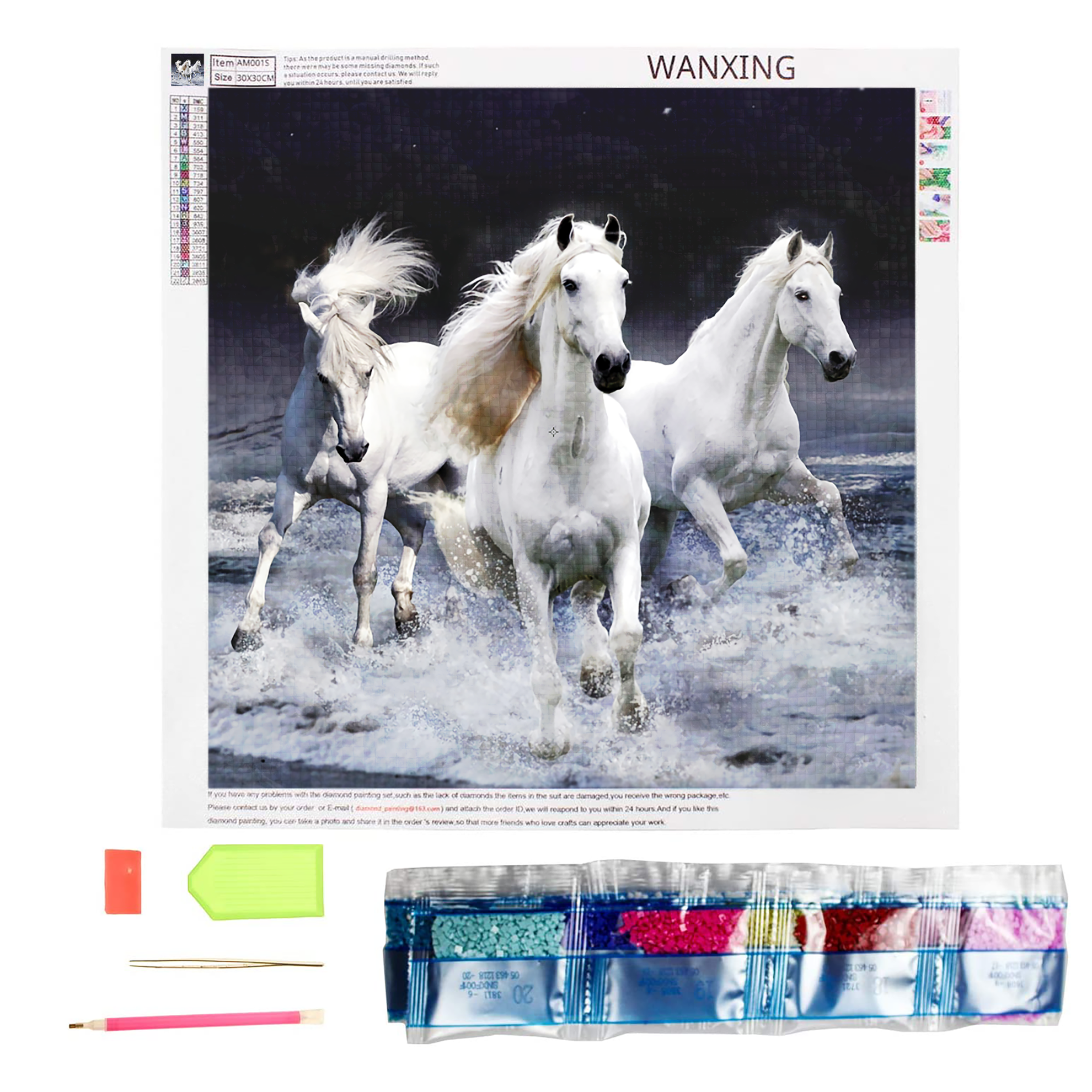 Plátno je zakryto ochrannou fólií, kterou sundávejte vždy postupně tak, jak budete aplikovat kamínky. Při sundání celé fólie najednou hrozí, že se ztratí viskozita lepidla a kamínky nebudou držet. Plátno obsahuje označení, která jsou umístěna i na sáčcích s kamínky. Dle těchto označení víte, kam který kamínek patří. Nejprve si do hrotu tužky naberte vosk, díky kterému se kamínky snadno přichytí na tužku. Kamínky tužkou aplikujte na plátno.