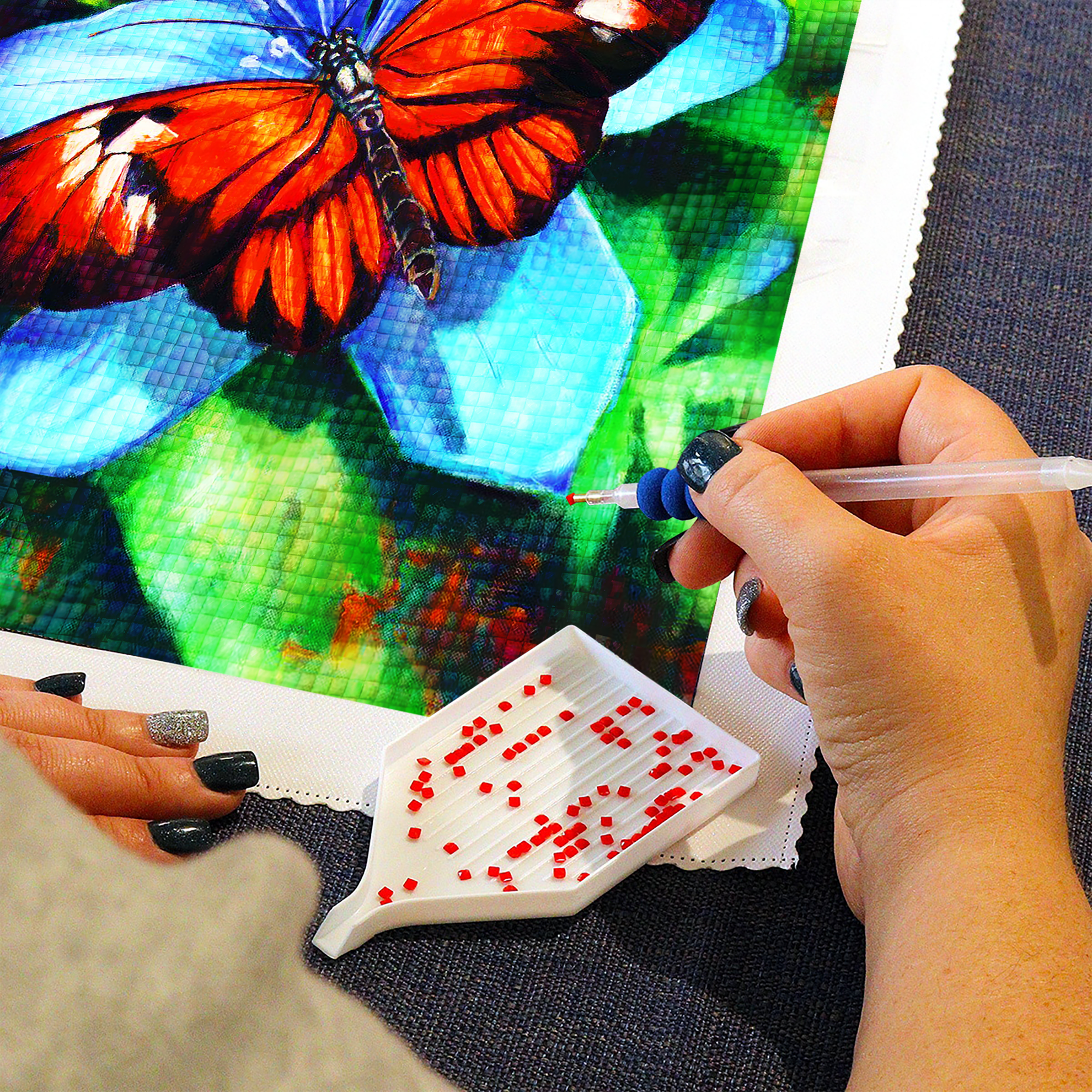 Plátno je zakryto ochrannou fólií, kterou sundávejte vždy postupně tak, jak budete aplikovat kamínky. Při sundání celé fólie najednou hrozí, že se ztratí viskozita lepidla a kamínky nebudou držet. Plátno obsahuje označení, která jsou umístěna i na sáčcích s kamínky. Dle těchto označení víte, kam který kamínek patří. Nejprve si do hrotu tužky naberte vosk, díky kterému se kamínky snadno přichytí na tužku. Kamínky tužkou aplikujte na plátno.