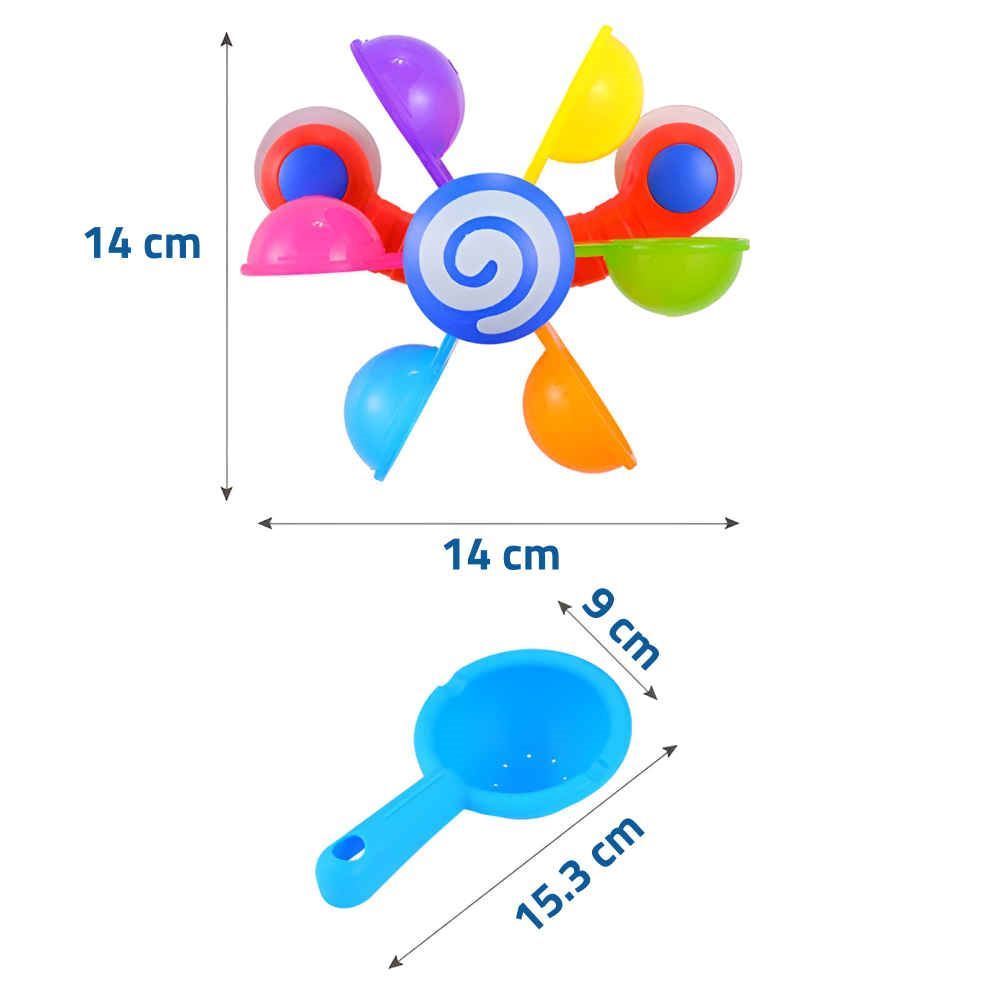 Děti mohou s cedníkem a lopatkou pracovat na svých jemných motorických dovednostech a učit se o pohybu vody, což podporuje přirozenou dětskou zvídavost. Mlýnské kolo drží na zdi vany díky dvěma přísavkám.