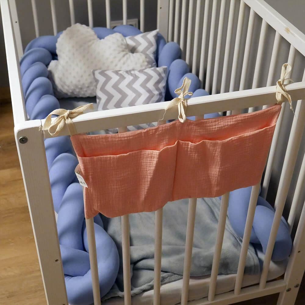 Popadané dudlíky, kousátka, zkrátka vše, co by se nemělo jen tak válet po zemi, nebo chaos v potřebách pro miminko? Nepořádek vyřeší tento hebký kapsář z mušelínové bavlny, který snadno přivážete k dětské postýlce, a uložíte do něj vše, co budete potřebovat. Od věcí, které vaše dítko používá každý den, tak třeba po nezbytnosti, které potřebujete mít při ruce, když se mu věnujete.