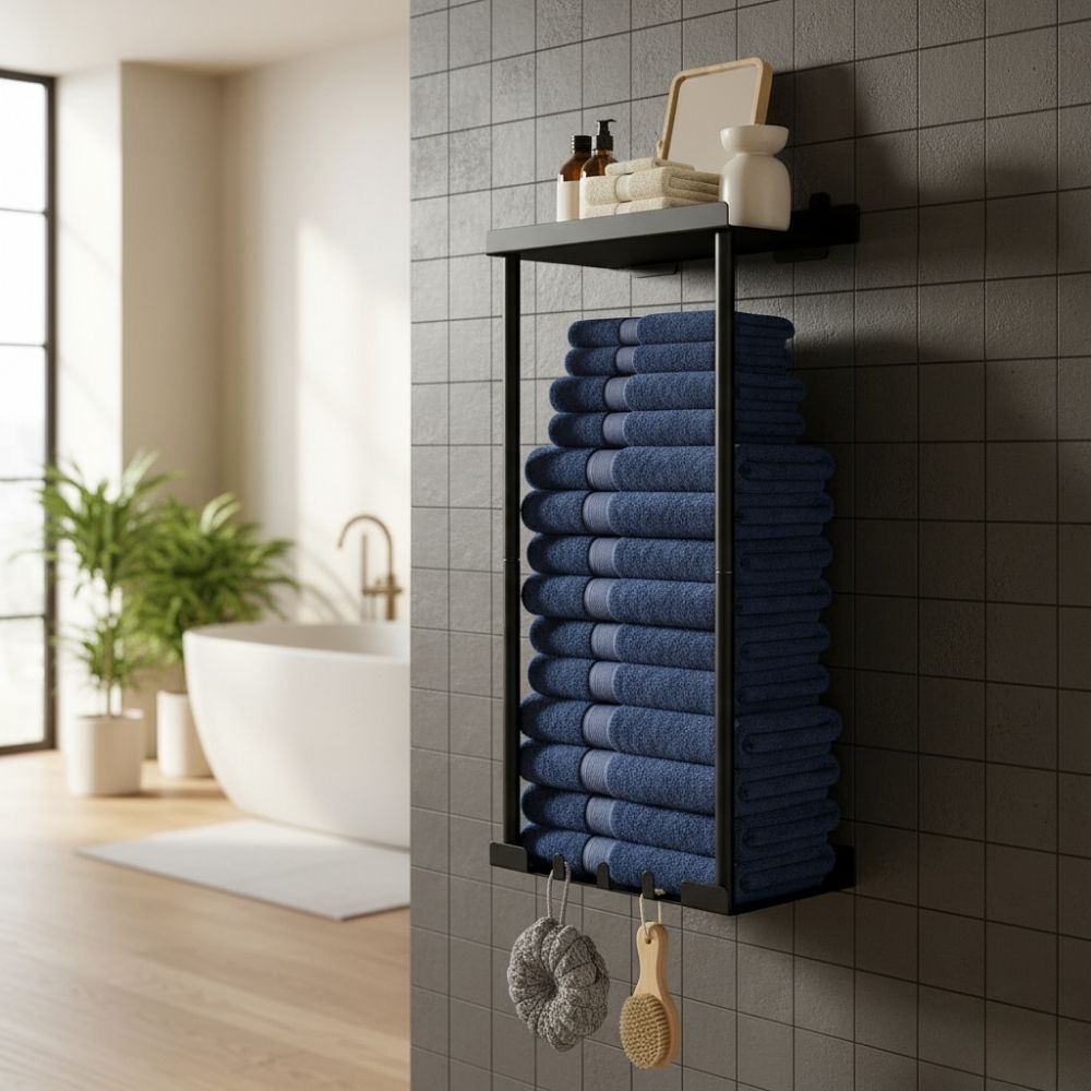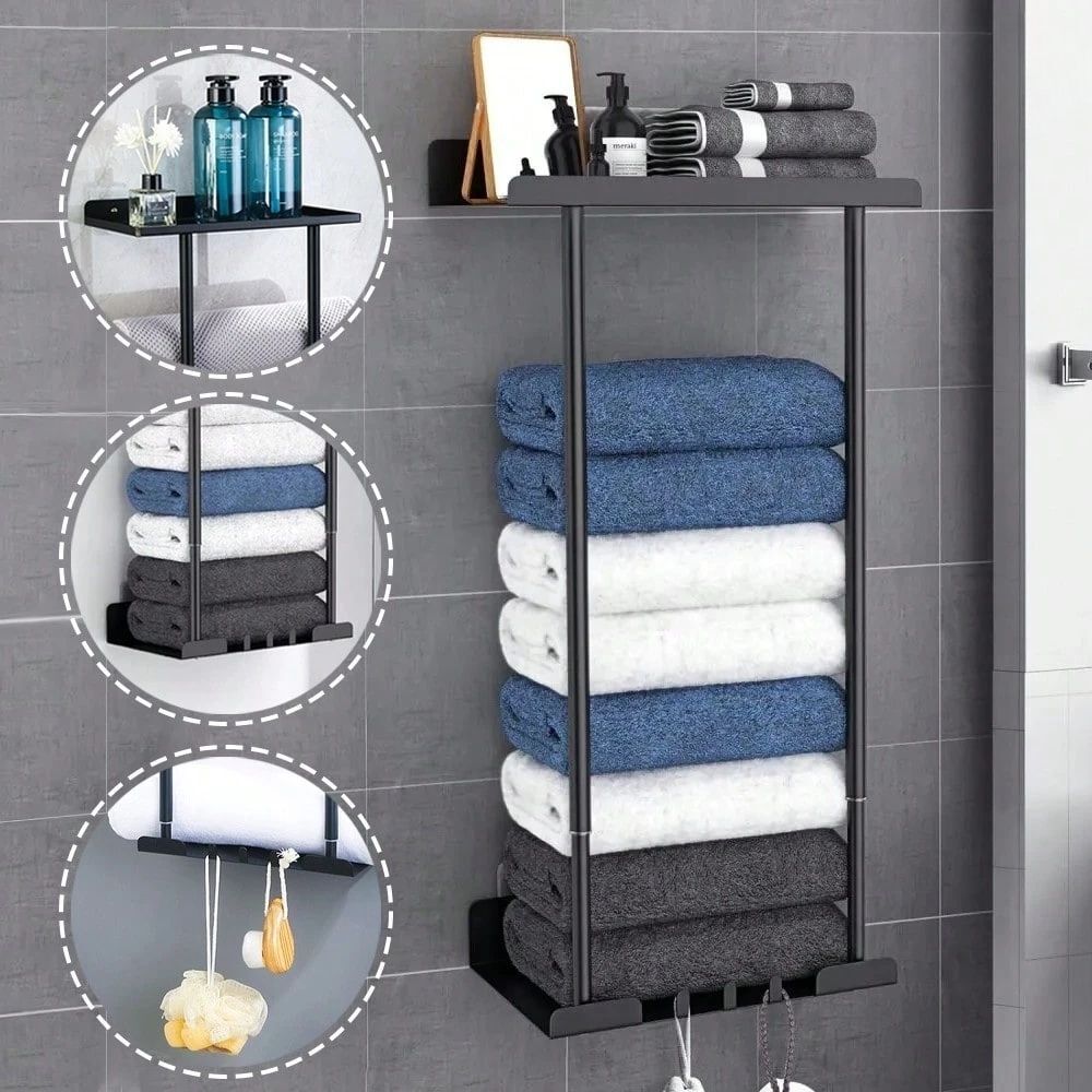 Elegantní černá kovová police s háčky a horní poličkou - skvělý pomocník do každé koupelny. Přehledně uložte ručníky, kosmetiku i koupelnové doplňky na jednom místě. Jednoduché sestavení a montáž bez vrtání díky samolepkám se šrouby v balení. Moderní design.