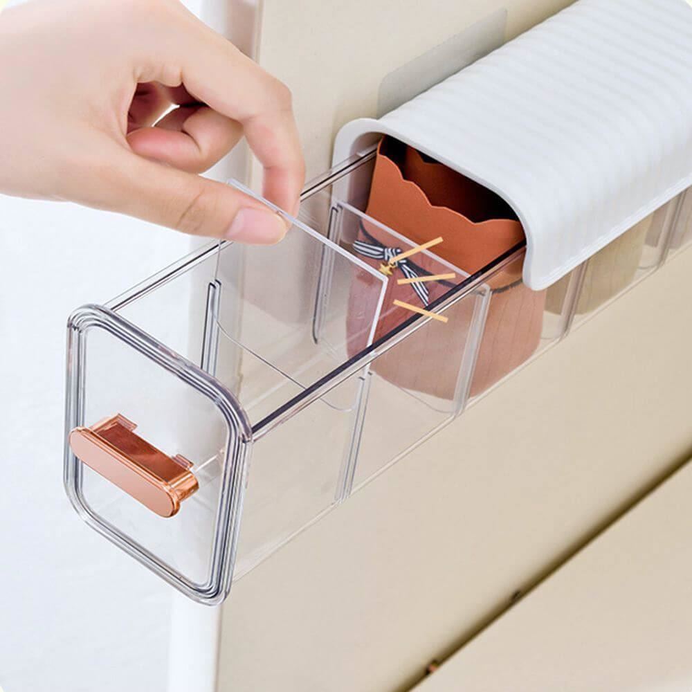 Organizér je průhledný a tak ihned uvidíte, co kde máte. Oddělovače přihrádek jsou vyndavací a tak si velikost přihrádek můžete přizpůsobit. Instalace je velmi jednoduchá, stačí pouze nalepit.