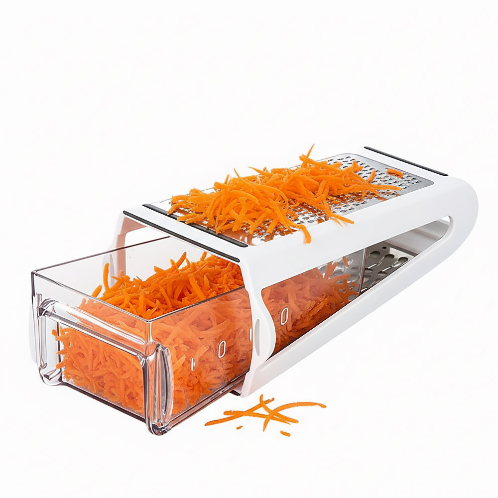 Zapomeňte na nepohodlné strouhání a nepořádek na kuchyňské lince. Toto obousměrné struhadlo vám umožní pracovat rychleji a efektivněji, aniž byste museli hlídat každý pohyb. Díky praktickému zásobníku se všechny nastrouhané suroviny zachytí na jednom místě. Stačí vysunout a rovnou použít. Vaření tak bude jednodušší, bezpečnější a mnohem příjemnější.