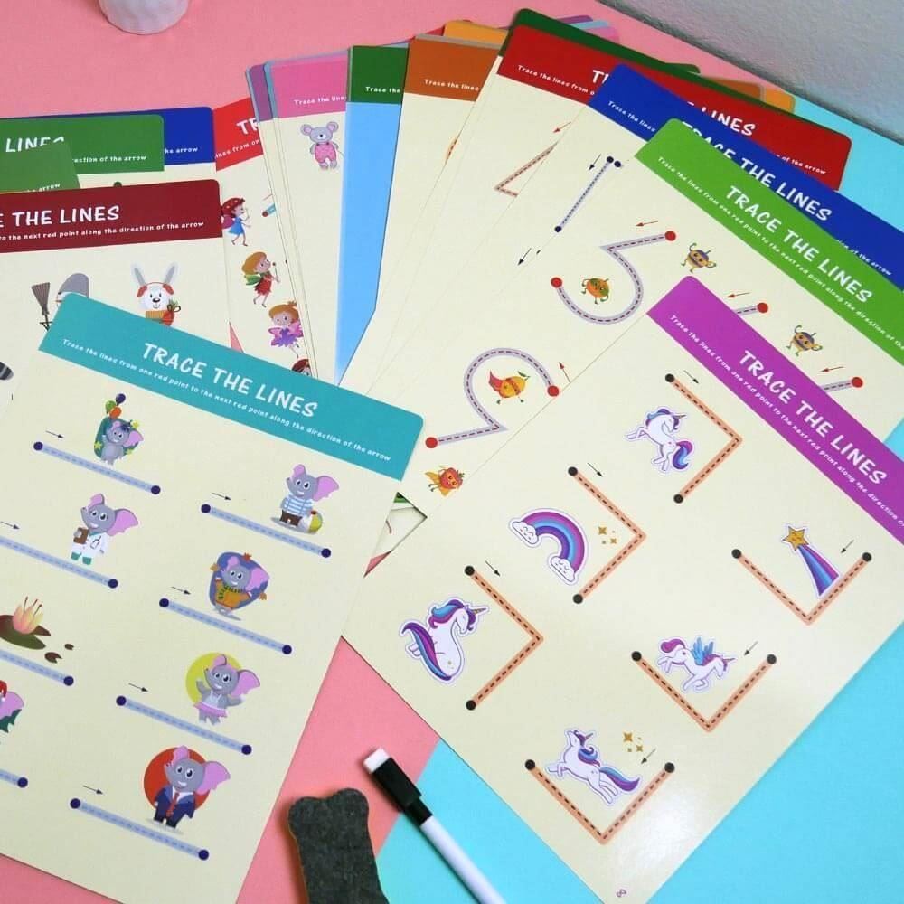 Obtahování, kreslení přímek a různých tvarů nebylo nikdy snazší! Tyto pracovní listy v sadě s houbičkou a fixou krásně rozvíjí dětskou motoriku a kreativitu. Cílem je vždy spojit dva body ve směru šipek.