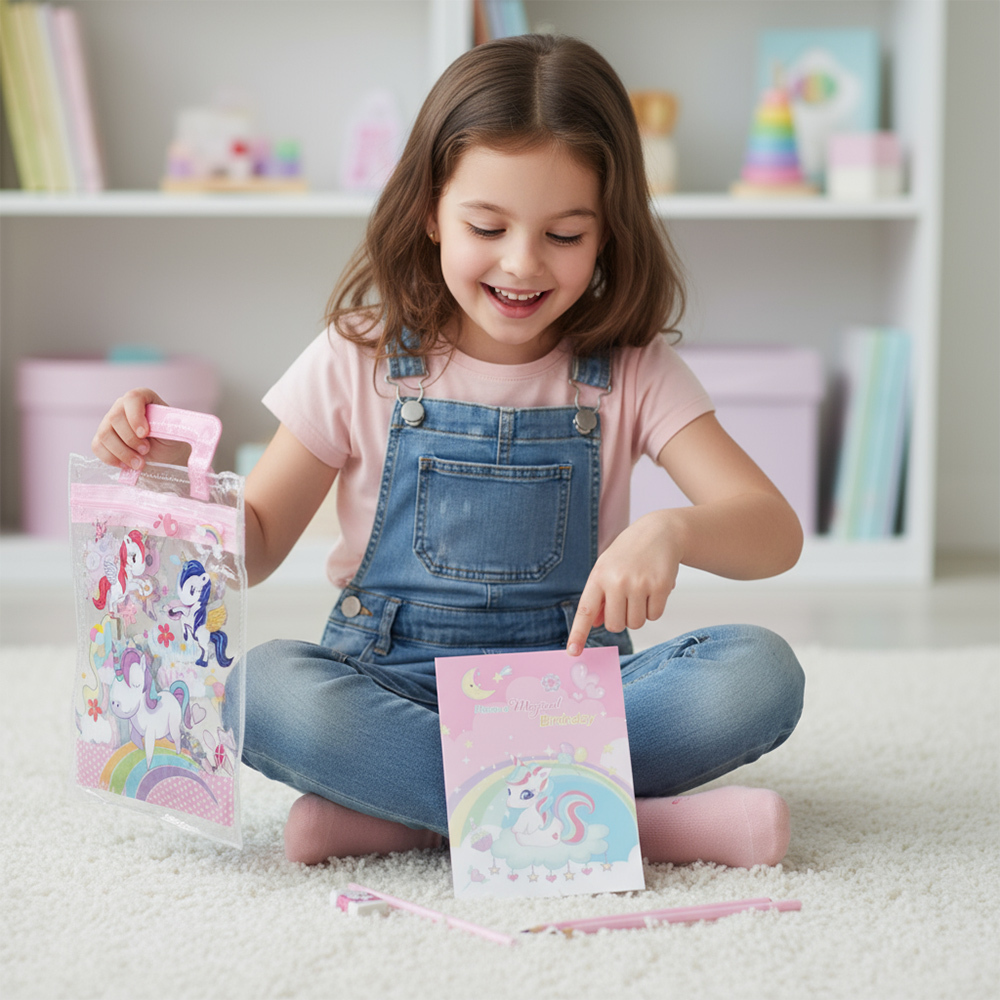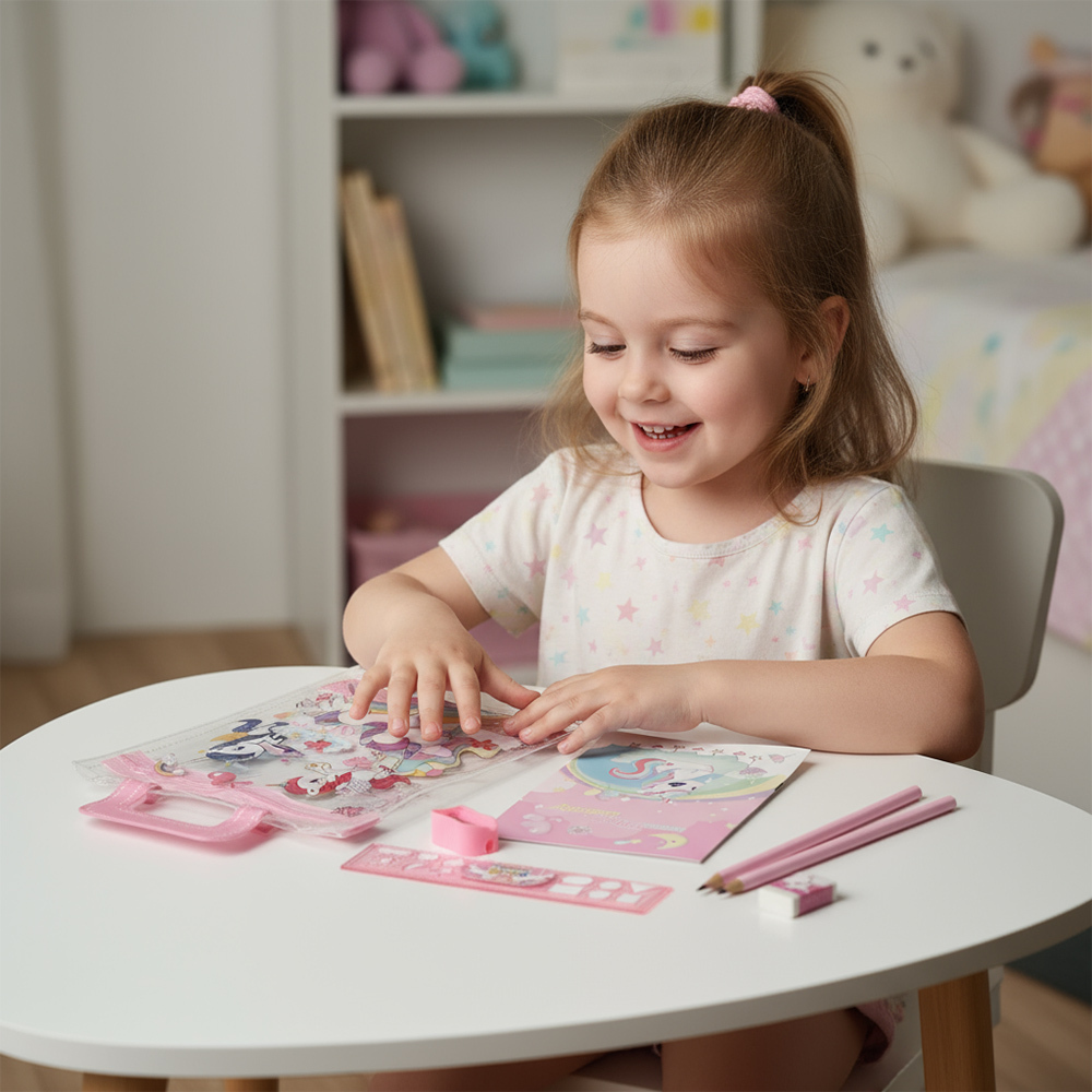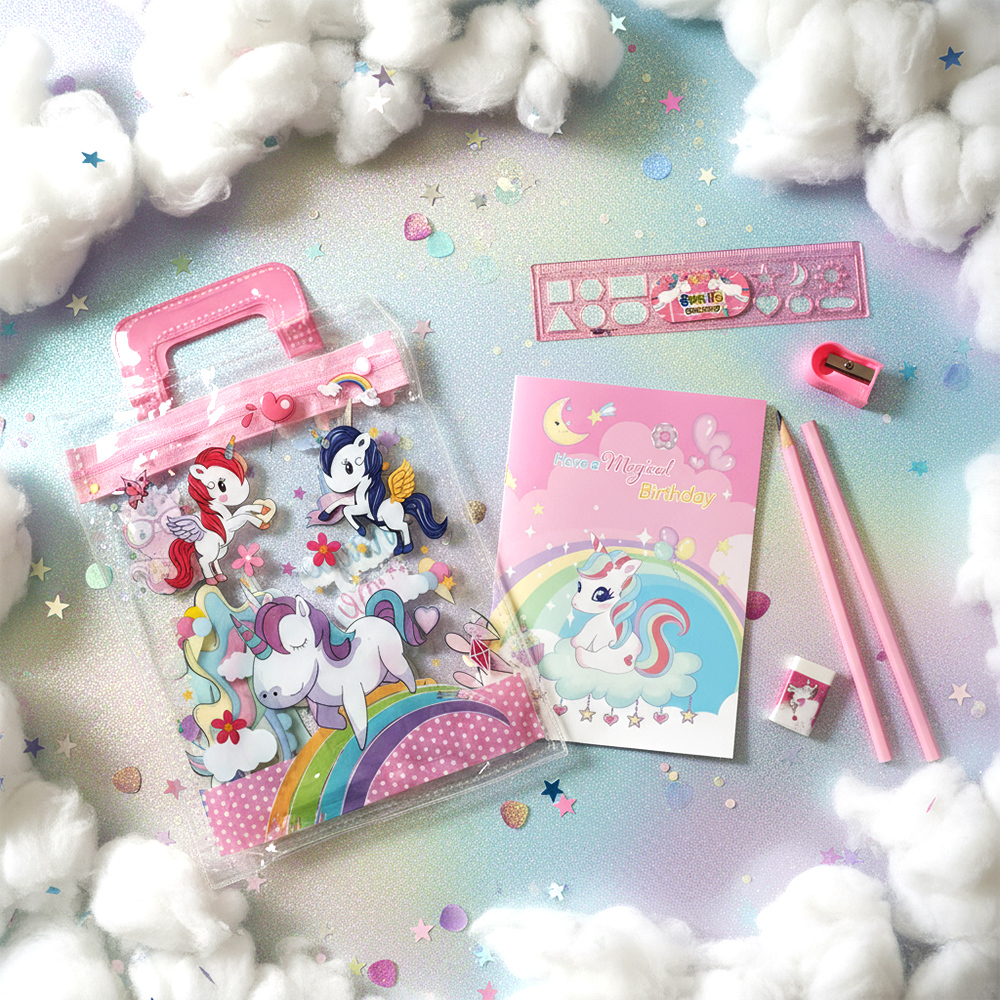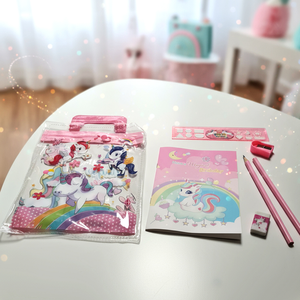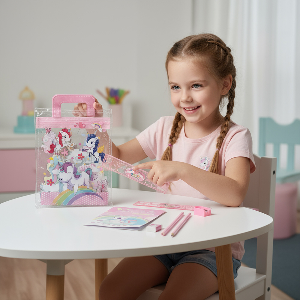 Tato pestrá sada školních pomůcek s motivem jednorožce promění každý den ve škole v malý zážitek! Najdete v ní vše potřebné – sešit, dvě tužky, gumu, ořezávátko, pravítko se vzory a praktickou taštičku, takže bude mít vaše školačka všechno po ruce. Barevný design s oblíbeným jednorožcem rozsvítí školní lavici a podpoří chuť do učení i kreativitu. Sada je skvělým dárkem pro první školní den, narozeniny nebo jen tak pro radost.
