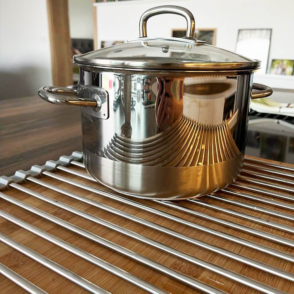 Skládací odkapávač na nádobí se stane nezbytností v kuchyni. Pokud máte v kuchyni málo místo bude tím pravým. Odkapávač snadno složíte a zase rozložíte. Pokud ho zrovna nebudete chtít mít na lince, složíte ho do ruličky a můžete ho umístit kamkoliv. Nezabere skoro žádné místo a budete ho mít tak při ruce. Odkapávač je velice stabilní. Výhoda tohoto odkapávače oproti klasickým plastovým odkapávačům je taková, že voda bude z nádobí stékat přímo do dřezu a nebude se nikde držet a třeba plesnivět. Odkapávač nemusíte ani nijak výrazně čistit, jelikož tam voda nikde nezůstává a nedrží se.