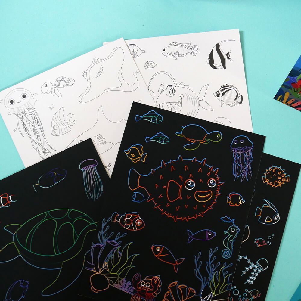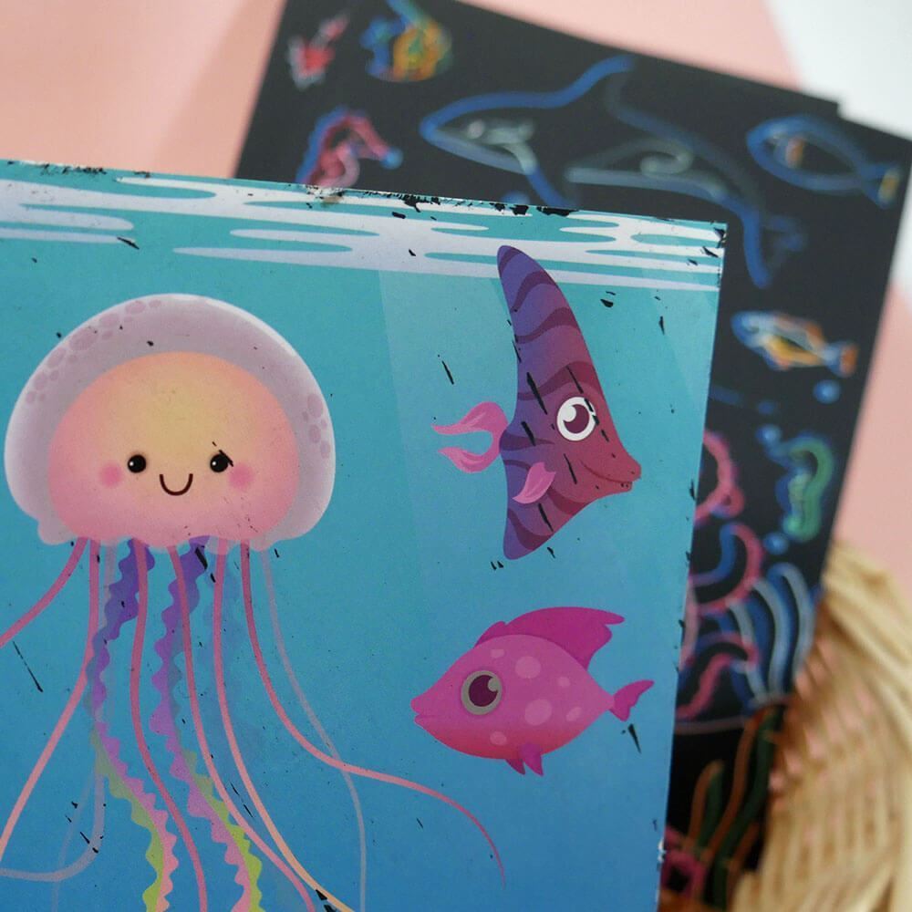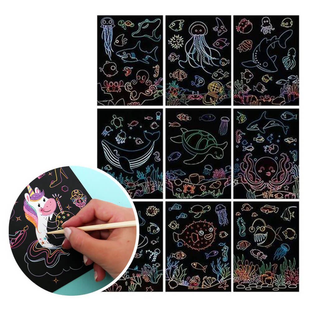 Máte doma malého milovníka umění? Pak budou tyhle originální omalovánky ten pravý dárek! Seškrabávací obrázky patří k oblíbené kreativní aktivitě i mezi dospělými. Tyto jsou v menším provedením s dětskými veselými designy. Balení obsahuje celkem 9 kartiček s různými obrázky. Ty lze jednoduše seškrabávat speciálním perem, které je také obsaženo v balení. Při seškrabávání se pod černou vrstvou začnou objevovat veselé jemné barvy. Při seškrabávání obrázku nevadí, pokud děti přetáhnou přes okraj.