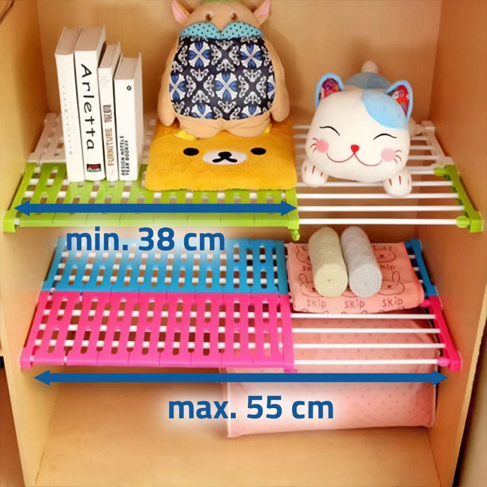 Variabilní polička, kterou si nastavíte dle vašich potřeb! Tato nastavitelná police vám vyřeší problém s úložným prostorem. Pokud doma máte spoustu věcí a málo úložného prostoru, určitě oceníte tuto přídavnou polici. Je přizpůsobivá – lze ji roztáhnout od cca 38 cm do 55 cm.