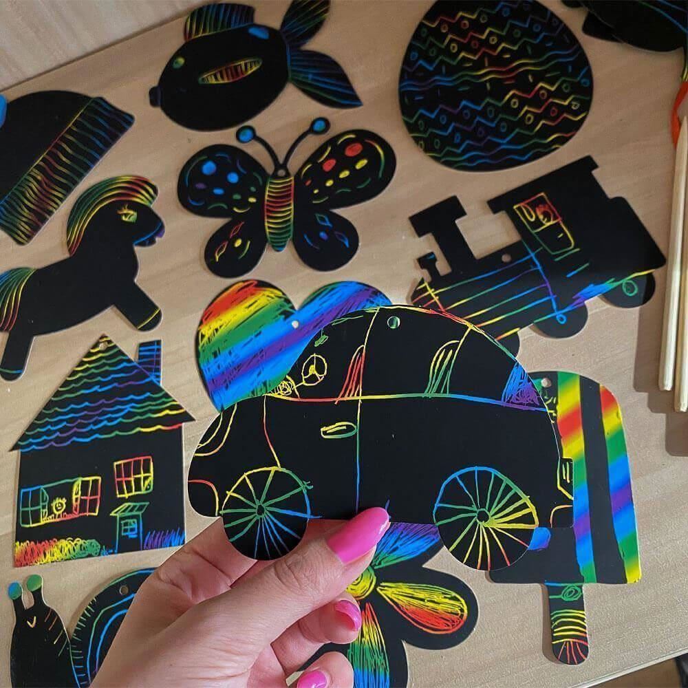 Kreativní vyškrabávací sada pro malé šikulky. S touto sadou se děti nebudou nudit. Velké množství obrázků, které pro děti představují obrovské překvapení. Jsou pokryty černou vyškrabávací vrstvou a jaké barvy skrývají musí děti objevit. Vyškrabávat obrázky mohou dle své fantazie.
